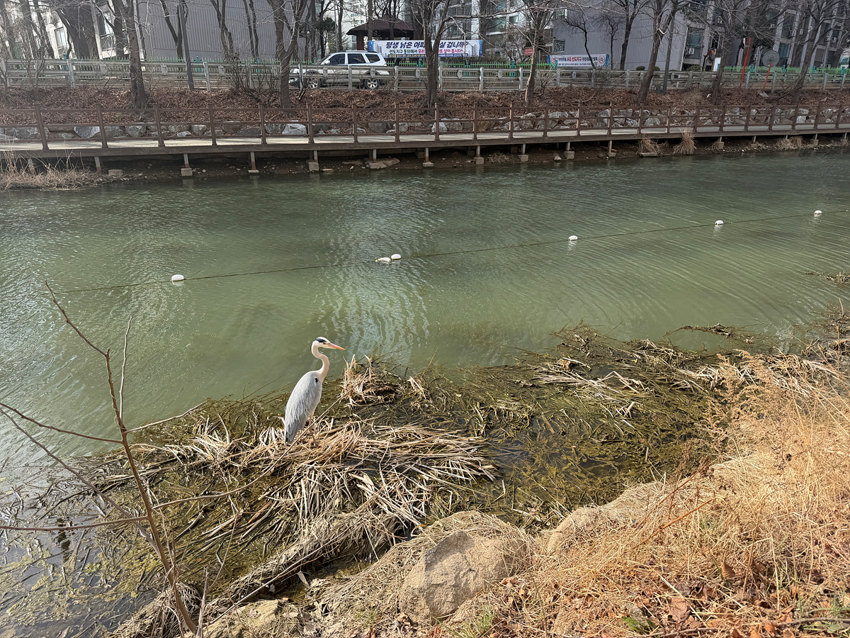 집으로 돌아가는 길에 왜가리를 만났다. 강가에서 곧은 자세로 하염없이 강물을 바라보고 있었다. 꽤나 가까이 있어 자세히 볼 수 있었는데 조그마한 새들과 달리 사람을 무서워하거나 신경 쓰지 않았다. 물에서 나와 조심조심 수풀 위를 걸어 다닌다. 늘 물에 잠겨있던 왜가리의 발이 닭발처럼 생겼다는 사실에 새삼 놀라고. 사진도 찍고 영상도 찍었다. 왜가리의 가늘고 긴 까만 깃털이 바람에 나부끼지 않았다면 “화면정지 아님” 자막이 어울리는 장면이었다.